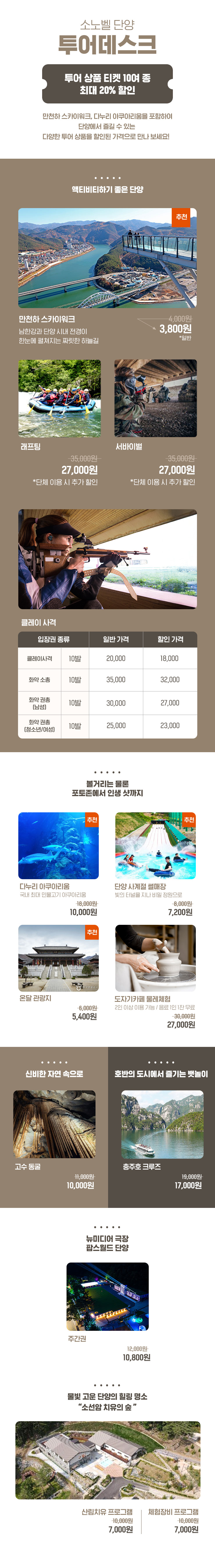 한국관광의 별로 선정된 만천하스카이워크를 포함하여, 단양에서 즐길 수 있는 다양한 투어상품을 할인된 가격으로 만나보세요!