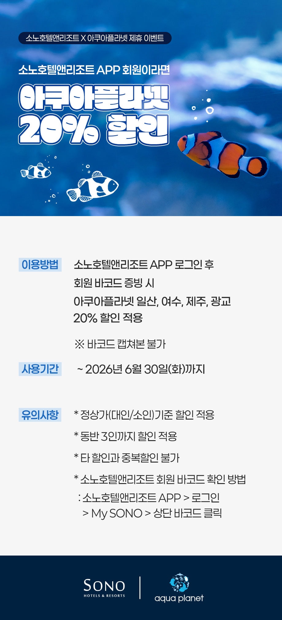 소노호텔앤리조트 APP회원이라면 아쿠아플라넷 20% 할인!